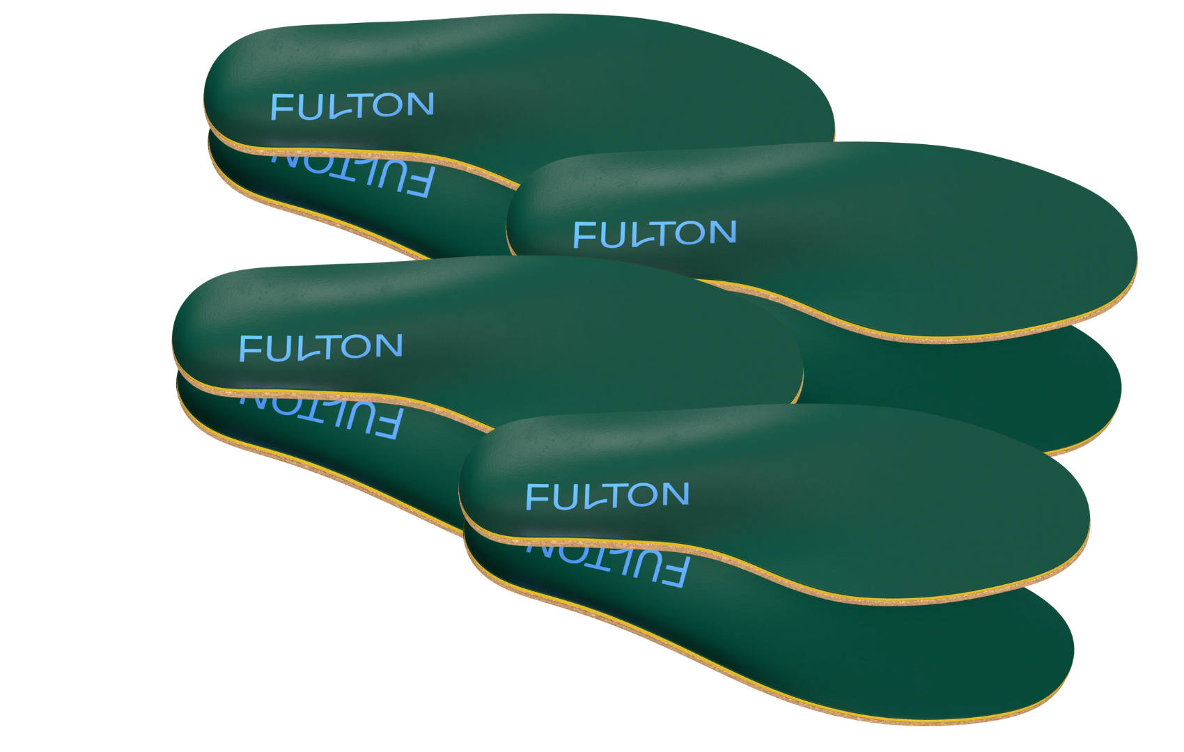 Fulton insoles offer a deep heel cup and cork arch support designed to provide stability and pain relief from toe to head.